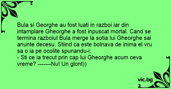 Bula si Georghe au fost luati in razboi iar din intamplare Gheorghe a fost inpuscat mortal. Cand se termina razboiul Bula merge la sotia lui Gheorghe sai anunte decesu. Stiind ca este bolnava de inima el vru sa o ia pe ocolite spunandu-i: