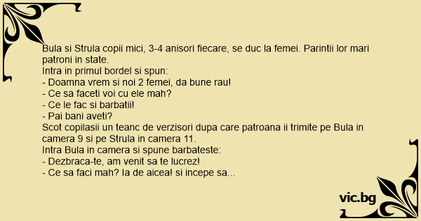Bula si Strula copii mici, 3-4 anisori fiecare, se duc la femei. Parintii lor mari patroni in state.