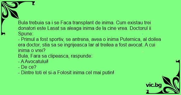 Bula trebuia sa i se Faca transplant de inima. Сuм existau trei donatori este Lasat sa aleaga inima de la cine vrea. Doctorul ii Spune:
