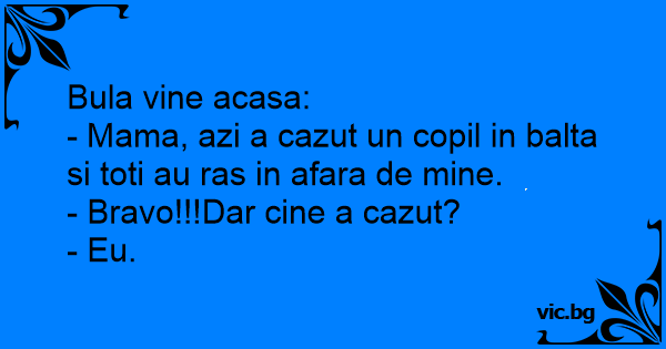 - Mama, azi a cazut un copil in balta si toti au ras in afara de mine.