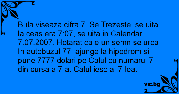 Bula viseaza cifra 7. Se Trezeste, se uita la ceas era 7:07, se uita in Calendar 7.07.2007. Hotarat ca e un semn se urca In autobuzul 77, ajunge la hipodrom si pune 7777 dolari pe Calul cu numarul 7 din cursa a 7-a. Calul iese al 7-lea.