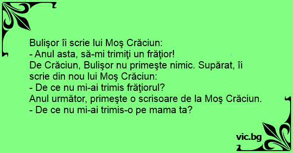 Bula, la 5 ani ii trimite scrisoare mosului de Craciun: ,,Draga Mosule, vreau sa am un fratior mai mic'' Mosul o citeste, si ii trimite lui Bula o alta scrisoare: ,,Atunci trimite-mi-o pe mamica ta!''
