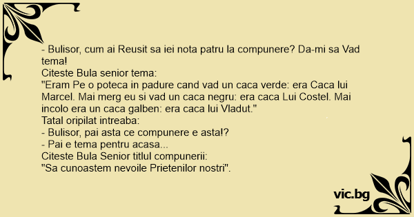 - Bulisor, сuм ai Reusit sa iei nota patru la compunere? Da-mi sa Vad tema!