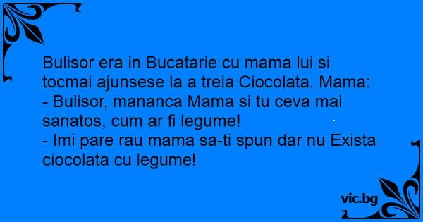 Bulisor era in Bucatarie cu mama lui si tocmai ajunsese la a treia Ciocolata. Mama: