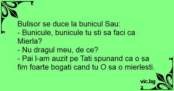 - Pai l-am auzit pe Tati spunand ca o sa fim foarte bogati cand tu O sa o mierlesti.