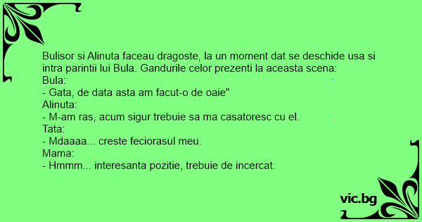 Bulisor si Alinuta faceau dragoste, la un moment dat se deschide usa si intra parintii lui Bula. Gandurile celor prezenti la aceasta scena:
