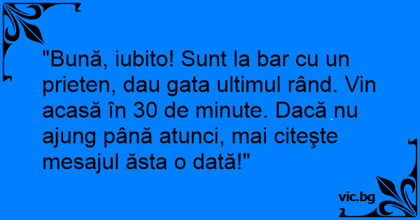 "Bună, iubito! Sunt la bar cu un prieten, dau gata ultimul rând. Vin acasă în 30 de minute. Dacă nu ajung până atunci, mai citeşte mesajul ăsta o dată!"