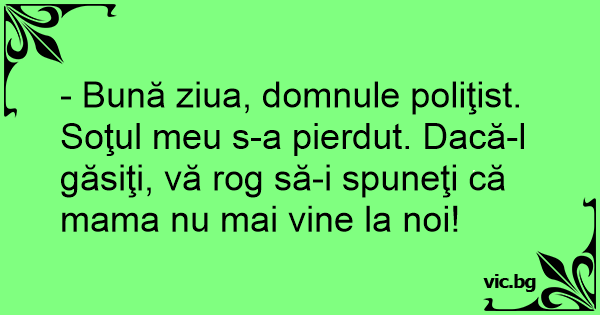 - Bună ziua, domnule poliţist. Soţul meu s-a pierdut. Dacă-l găsiţi, vă rog să-i spuneţi că mama nu mai vine la noi!