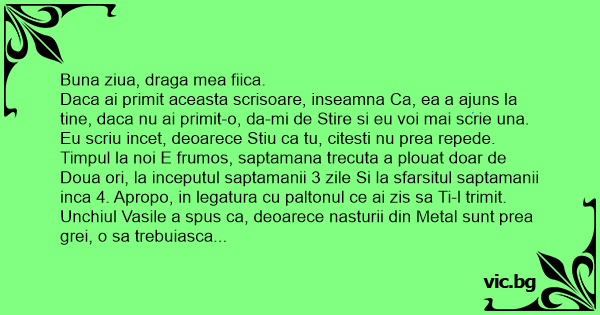 Daca ai primit aceasta scrisoare, inseamna Ca, ea a ajuns la tine, daca nu ai primit-o, da-mi de Stire si eu voi mai scrie una. Eu scriu incet, deoarece Stiu ca tu, citesti nu prea repede.