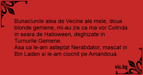 Bunaciunile alea de Vecine ale mele, doua blonde gemene, mi-au zis ca ma vor Colinda in seara de Halloween, deghizate in Turnurile Gemene.