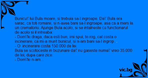 Bunicu\' lui Bula moare, si trebuia sa-l ingroape. Da\' Bula era sarac, ca toti romanii, si n-avea bani sa-l ingroape, asa ca a mers la un crematoriu. Ajunge Bula acolo, si se intalneste cu functionarul de acolo si il intreaba: