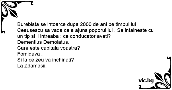 Burebista se intoarce dupa 2000 de ani pe timpul lui Ceausescu sa vada ce a ajuns poporul lui . Se intalneste cu un tip si il intreaba : ce conducator aveti?