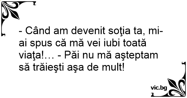 - Când am devenit soţia ta, mi-ai spus că mă vei iubi toată viaţa!… - Păi nu mă aşteptam să trăieşti aşa de mult!
