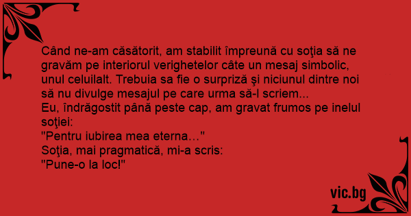 Când ne-am căsătorit, am stabilit împreună cu soţia să ne gravăm pe interiorul verighetelor câte un mesaj simbolic, unul celuilalt. Trebuia sa fie o surpriză şi niciunul dintre noi să nu divulge mesajul pe care urma să-l scriem...