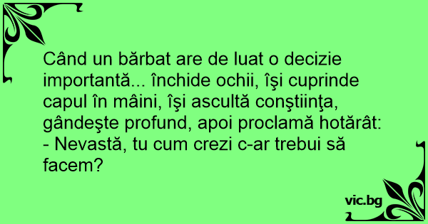 Când un bărbat are de luat o decizie importantă... închide ochii, îşi cuprinde capul în mâini, îşi ascultă conştiinţa, gândeşte profund, apoi proclamă hotărât: