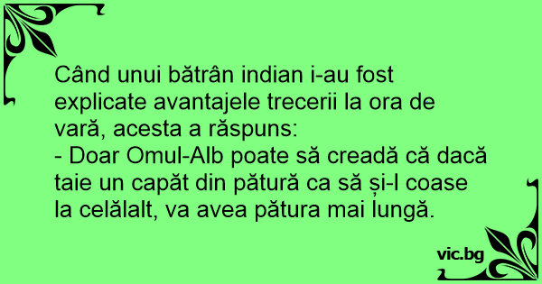 Când unui bătrân indian i-au fost explicate avantajele trecerii la ora de vară, acesta a răspuns: