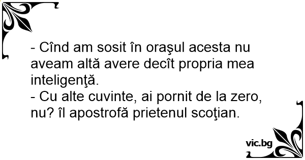 - Cu alte cuvinte, ai pornit de la zero, nu? îl apostrofă prietenul scoţian.