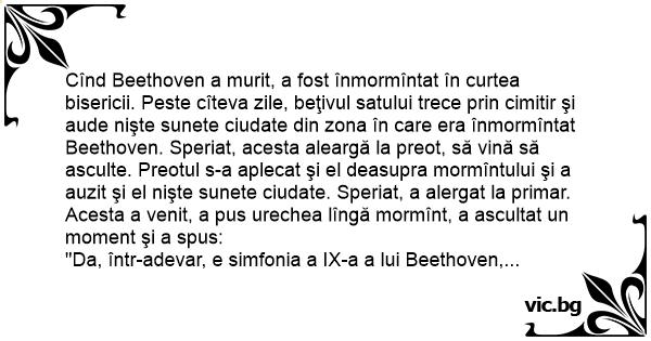 Cînd Beethoven a murit, a fost înmormîntat în curtea bisericii. Peste cîteva zile, beţivul satului trece prin cimitir şi aude nişte sunete ciudate din zona în care era înmormîntat Beethoven. Speriat, acesta aleargă la preot, să vină să asculte. Preotul s-a aplecat şi el deasupra mormîntului şi a auzit şi el nişte sunete ciudate. Speriat, a alergat la primar. Acesta a venit, a pus urechea lîngă mormînt, a ascultat un moment şi a spus: