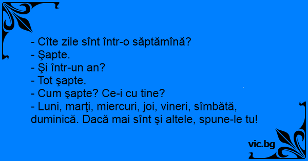 - Luni, marţi, miercuri, joi, vineri, sîmbătă, duminică. Dacă mai sînt şi altele, spune-le tu!