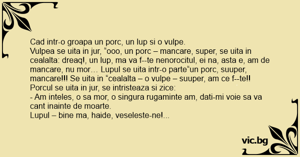 Vulpea se uita in jur, “ooo, un porc – mancare, super, se uita in cealalta: dreaq!, un lup, ma va f--te nenorocitul, ei na, asta e, am de mancare, nu mor… Lupul se uita intr-o parte“un porc, suuper, mancare!!! Se uita in “cealalta – o vulpe – suuper, am ce f--te!!