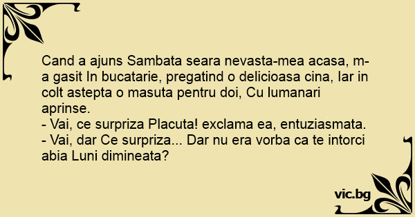 Cand a ajuns Sambata seara nevasta-mea acasa, m-a gasit In bucatarie, pregatind o delicioasa cina, Iar in colt astepta o masuta pentru doi, Cu lumanari aprinse.