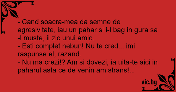 - Cand soacra-mea da semne de agresivitate, iau un pahar si i-l bag in gura sa-l muste, ii zic unui amic.