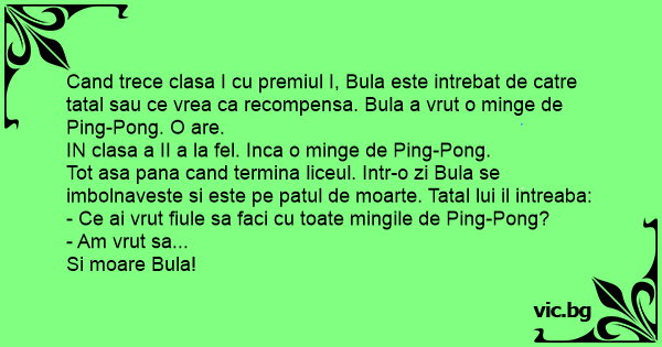 Cand trece clasa I cu premiul I, Bula este intrebat de catre tatal sau ce vrea ca recompensa. Bula a vrut o мingе de Ping-Pong. O are.