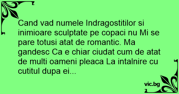 Когато видя имената на влюбените, издялкани в дърво, не мисля, че е сладко. Мисля, че е притеснително колко много хора носят ножове на срещите си