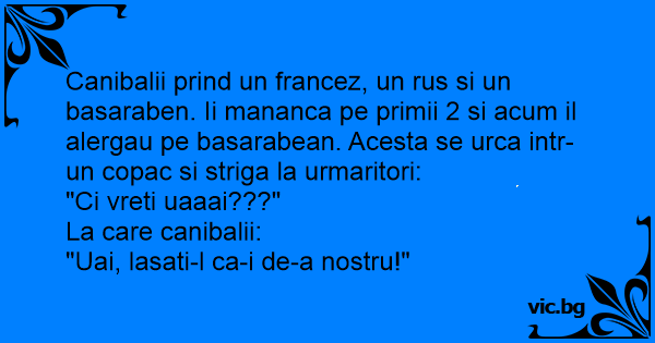 Canibalii prind un francez, un rus si un basaraben. Ii mananca pe primii 2 si acum il alergau pe basarabean. Acesta se urca intr-un copac si striga la urmaritori: