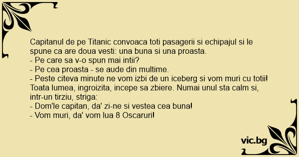 Capitanul de pe Titanic convoaca toti pasagerii si echipajul si le spune ca are doua vesti: una buna si una proasta.