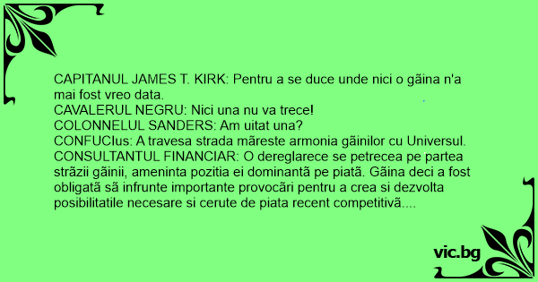 CAPITANUL JAMES T. KIRK: Pentru a se duce unde nici o gãina n'a mai fost vreo data.