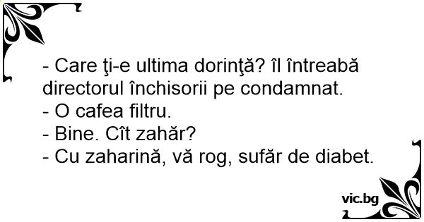 - Care ţi-e ultima dorinţă? îl întreabă directorul închisorii pe condamnat.