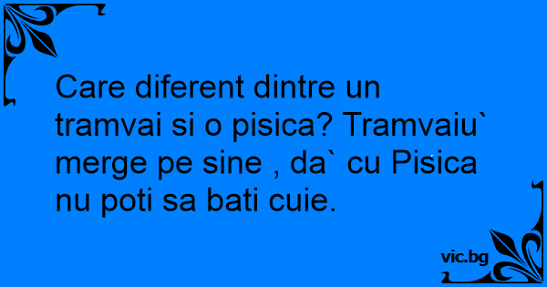 Care diferent dintre un tramvai si o pisica? Tramvaiu` merge pe sine , da` cu Pisica nu poti sa bati cuie.