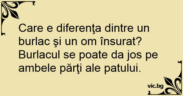 Care e diferenţa dintre un burlac şi un om însurat? Burlacul se poate da jos pe ambele părţi ale patului.