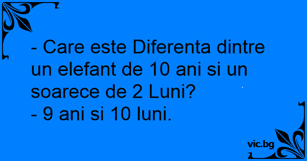 - Care este Diferenta dintre un elefant de 10 ani si un soarece de 2 Luni?- 9 ani si 10 luni. 58 0 0 bancuri cu animale Întrebări amuzante
