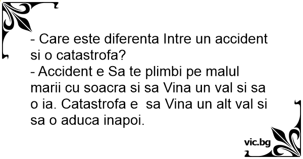 - Accident e Sa te plimbi pe malul marii cu soacra si sa Vina un val si sa o ia. Catastrofa e sa Vina un alt val si sa o aduca inapoi.