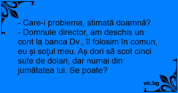 - Domnule director, am deschis un cont la banca Dv., îl folosim în comun, eu şi soţul meu. Aş dori să scot cinci sute de dolari, dar numai din jumătatea lui. Se poate?