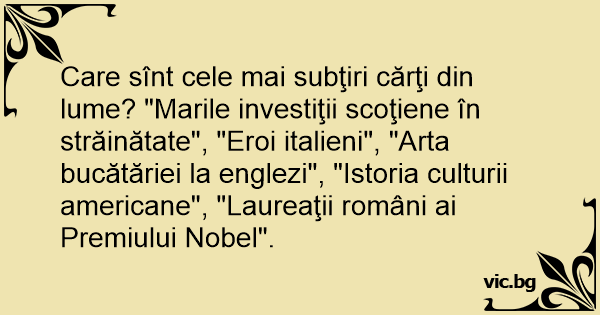 Care sînt cele mai subţiri cărţi din lume? "Marile investiţii scoţiene în străinătate", "Eroi italieni", "Arta bucătăriei la englezi", "Istoria culturii americane", "Laureaţii români ai Premiului Nobel".