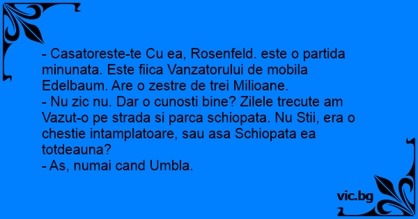 - Casatoreste-te Cu ea, Rosenfeld. este o partida minunata. Este fiica Vanzatorului de mobila Edelbaum. Are o zestre de trei Milioane.