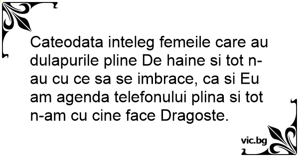 Cateodata inteleg femeile care au dulapurile pline De haine si tot n-au cu ce sa se imbrace, ca si Eu am agenda telefonului plina si tot n-am cu cine face Dragoste.
