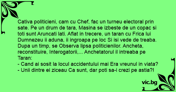 Cativa politicieni, cam cu Chef, fac un turneu electoral prin sate. Pe un drum de tara, Masina se izbeste de un copac si toti sunt Aruncati lati. Aflat in trecere, un taran cu Frica lui Dumnezeu ii aduna, ii ingroapa pe loc Si isi vede de treaba. Dupa un timp, se Observa lipsa politicienilor. Ancheta, reconstituire, Interogatorii,... Anchetatorul il intreaba pe Taran: