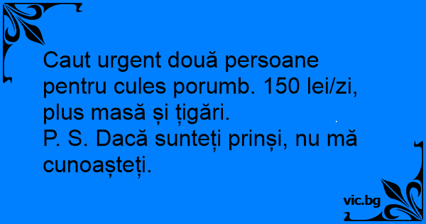 Caut urgent două persoane pentru cules porumb. 150 lei/zi, plus masă și țigări.