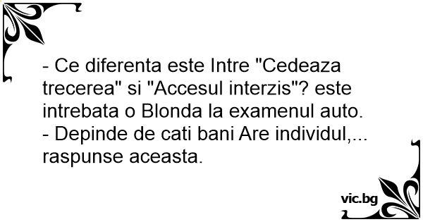 - Ce diferenta este Intre "Cedeaza trecerea" si "Accesul interzis"? este intrebata o Blonda la examenul auto.