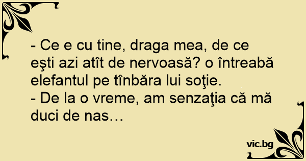 - Ce e cu tine, draga mea, de ce eşti azi atît de nervoasă? o întreabă elefantul pe tînbăra lui soţie.
