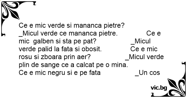 Ce e mic verde si mananca pietre? _Micul verde ce mananca pietre. Ce e mic galben si sta pe pat? _Micul verde palid la fata si obosit. Ce e mic rosu si zboara prin aer? _Micul verde plin de sange ce a calcat pe o mina. Ce e mic negru si e pe fata _Un cos