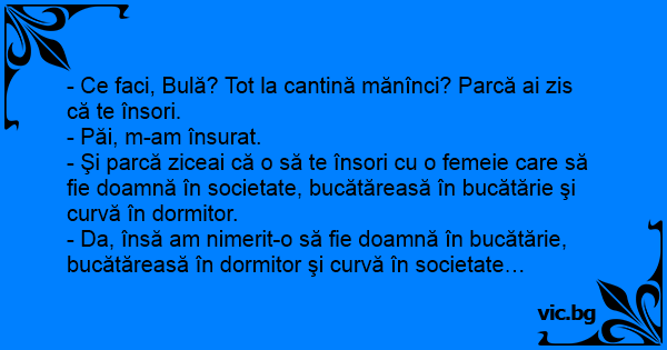 - Ce faci, Bulă? Tot la cantină mănînci? Parcă ai zis că te însori.
