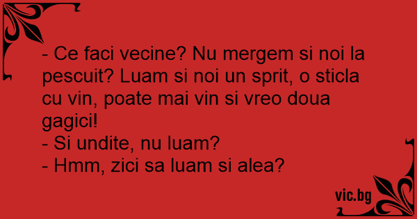 - Ce faci vecine? Nu mergem si noi la pescuit? Luam si noi un sprit, o sticla cu vin, poate mai vin si vreo doua gagici!