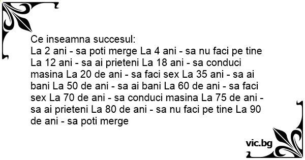 La 2 ani - sa poti merge La 4 ani - sa nu faci pe tine La 12 ani - sa ai prieteni La 18 ani - sa conduci masina La 20 de ani - sa faci sеx La 35 ani - sa ai bani La 50 de ani - sa ai bani La 60 de ani - sa faci sеx La 70 de ani - sa conduci masina La 75 de ani - sa ai prieteni La 80 de ani - sa nu faci pe tine La 90 de ani - sa poti merge