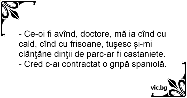 - Ce-oi fi avînd, doctore, mă ia cînd cu cald, cînd cu frisoane, tuşesc şi-mi clănţăne dinţii de parc-ar fi castaniete.