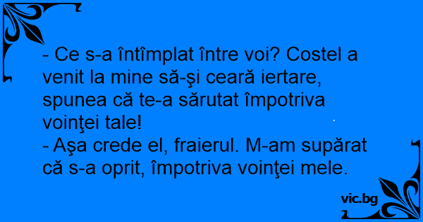 - Ce s-a întîmplat între voi? Costel a venit la mine să-şi ceară iertare, spunea că te-a sărutat împotriva voinţei tale!